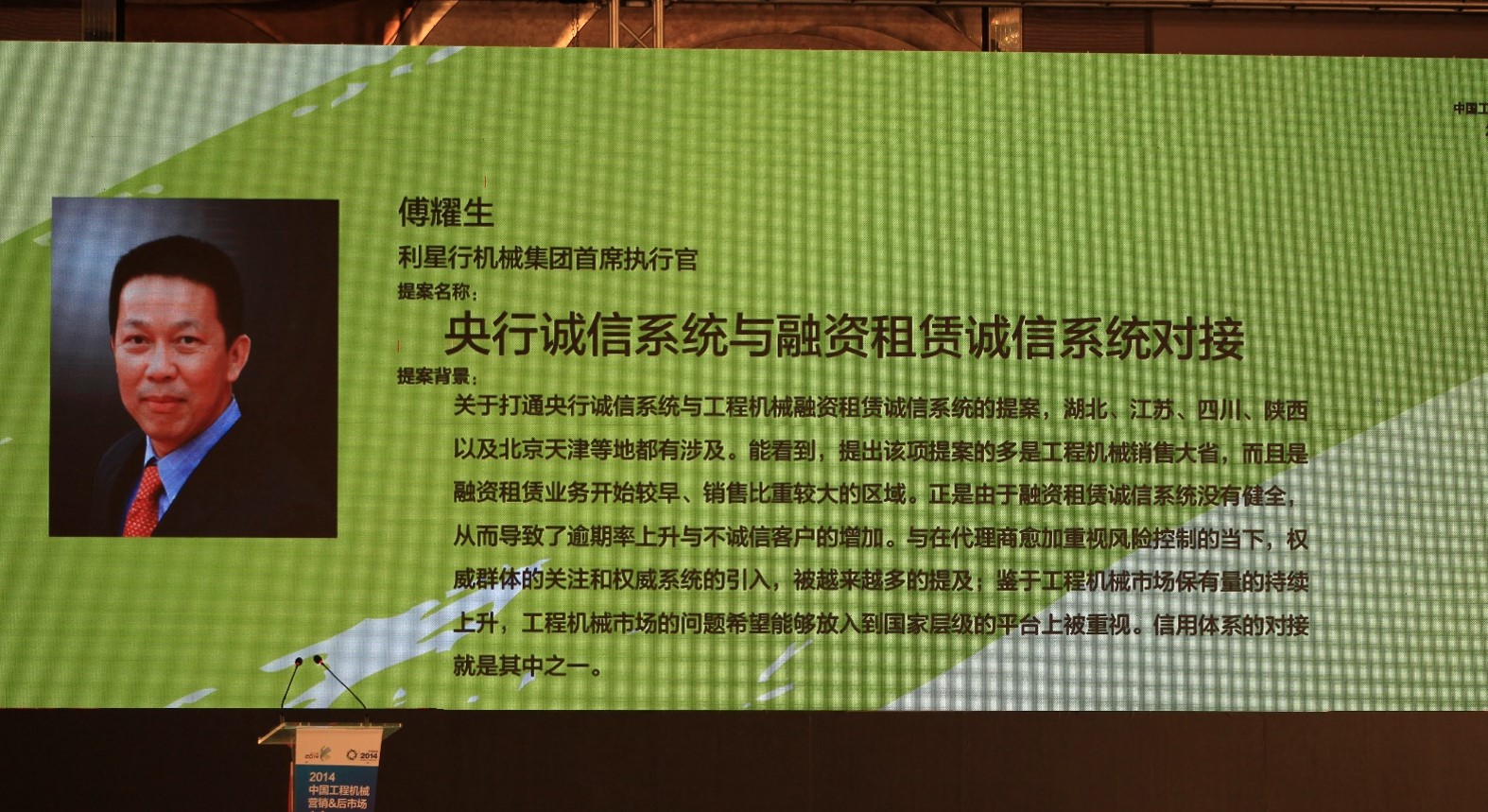 作為工程機械協會代理商工作委員會的常務副理事長,利星行機械集團首席執行官傅耀生先生也參加了此次盛會。傅耀生先生一直關注并積極致力于推動工程機械行業的健康發展,并于2012年出任首輪輪值會長,在此期間他提出了“培育中小代理商的成長發展”并主導開展了一系列中小代理商的培訓和學習活動。本次會議中作為巔峰對話的首位發言嘉賓,他就如何推動“央行誠信系統和融資租賃公司誠信系統對接”發表了獨特見解,引起與會者的強烈共鳴,獲得了專家評審團的全票支持。此議題也被評為最受關注的三個議題之首,將被列為下一年度行業領導與相關政府部門溝通推進的工作重點。